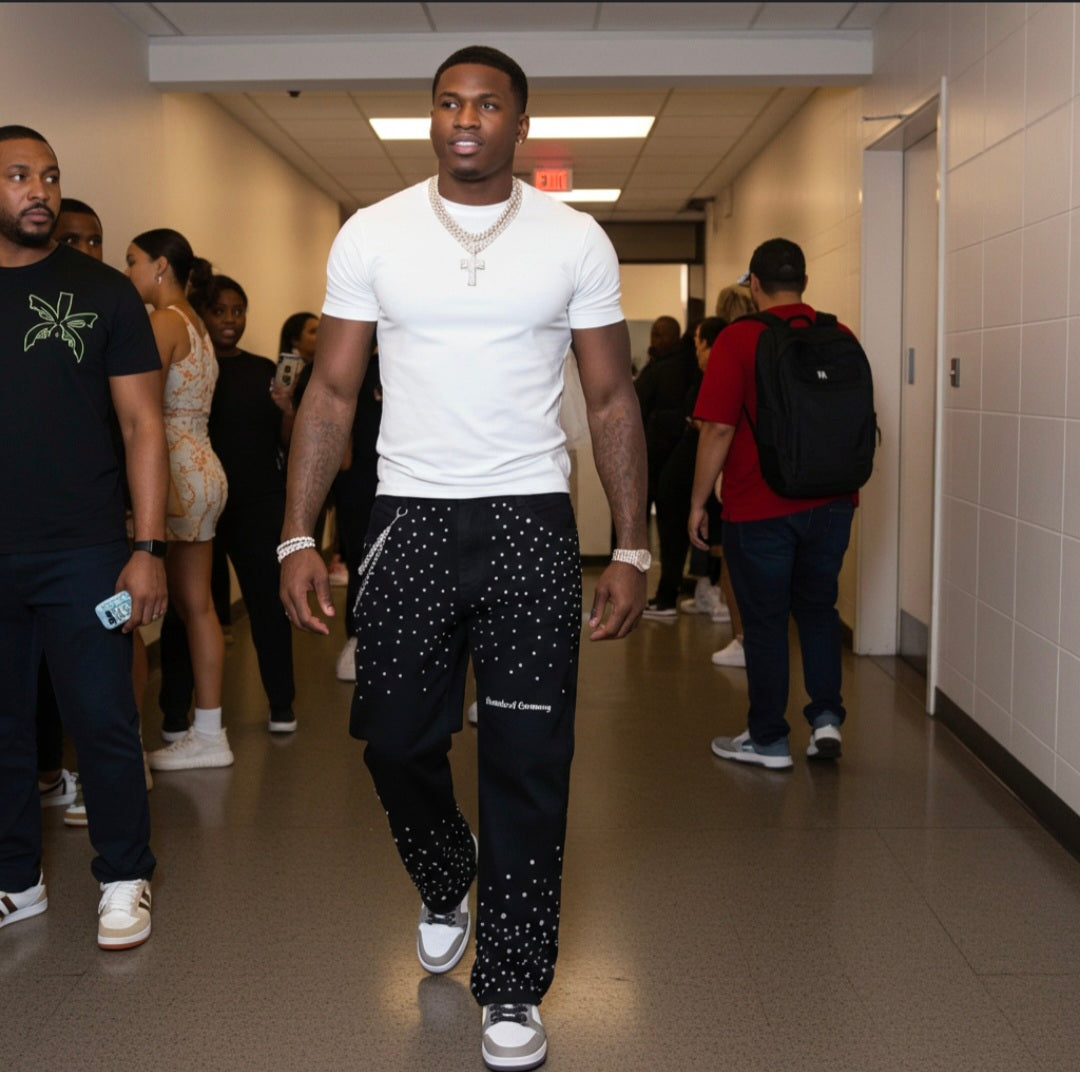 Elevate your denim game with Jhaunta's custom rhinestone-embellished jeans. These unisex relaxed straight leg jeans blend timeless style with eye-catching sparkle, featuring meticulously placed rhinestones that transform ordinary denim into a statement piece. Perfect for those who refuse to blend in, each pair is thoughtfully designed to catch light and turn heads. Whether you're dressing up for a night out or adding glamour to casual wear, these jeans deliver versatility without compromise. Experience the confidence that comes with wearing something truly unique—designed custom, crafted for you.